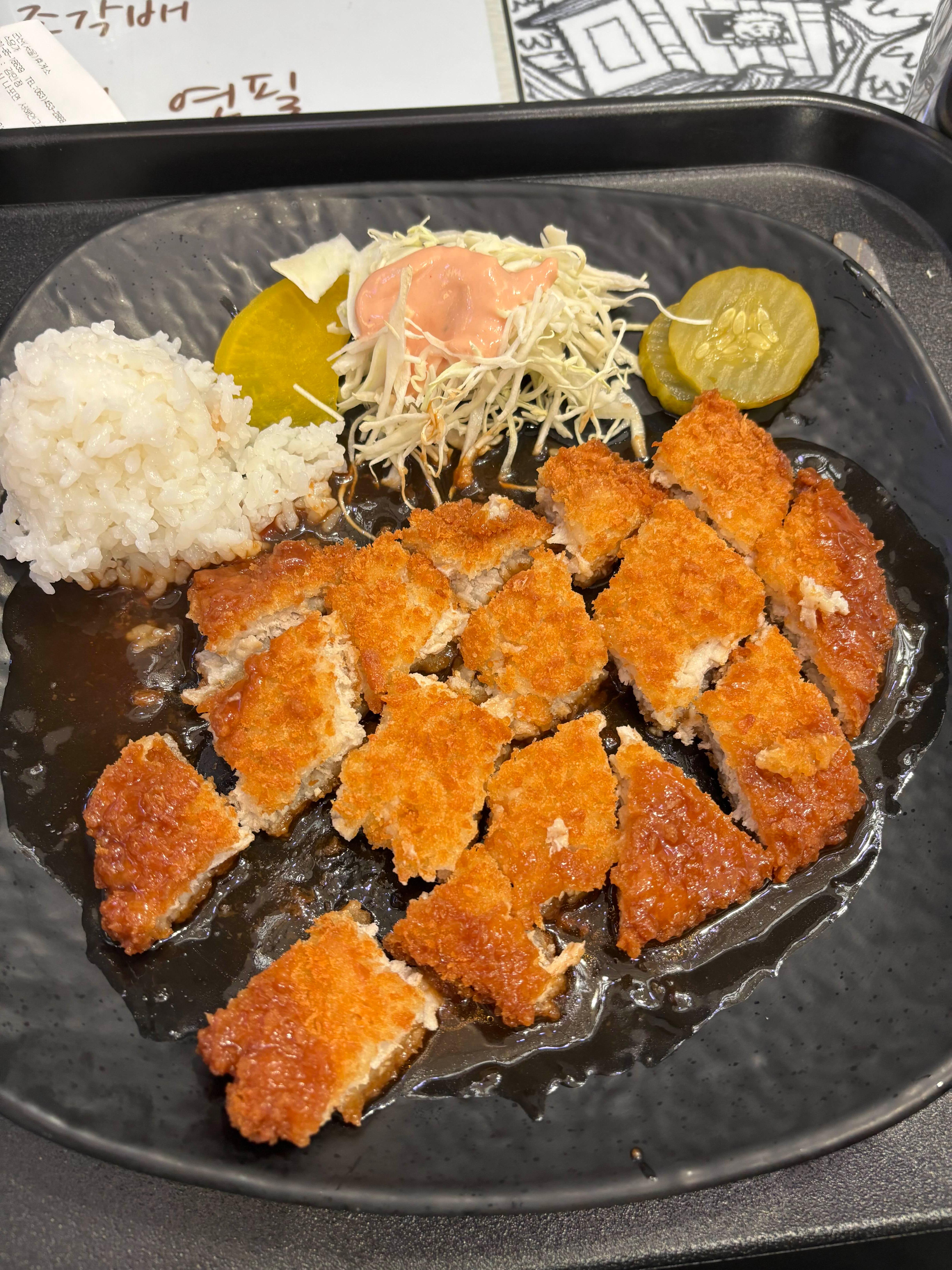 돈까스를 뒤집으면 바삭하게 먹을 수 있다고 해서